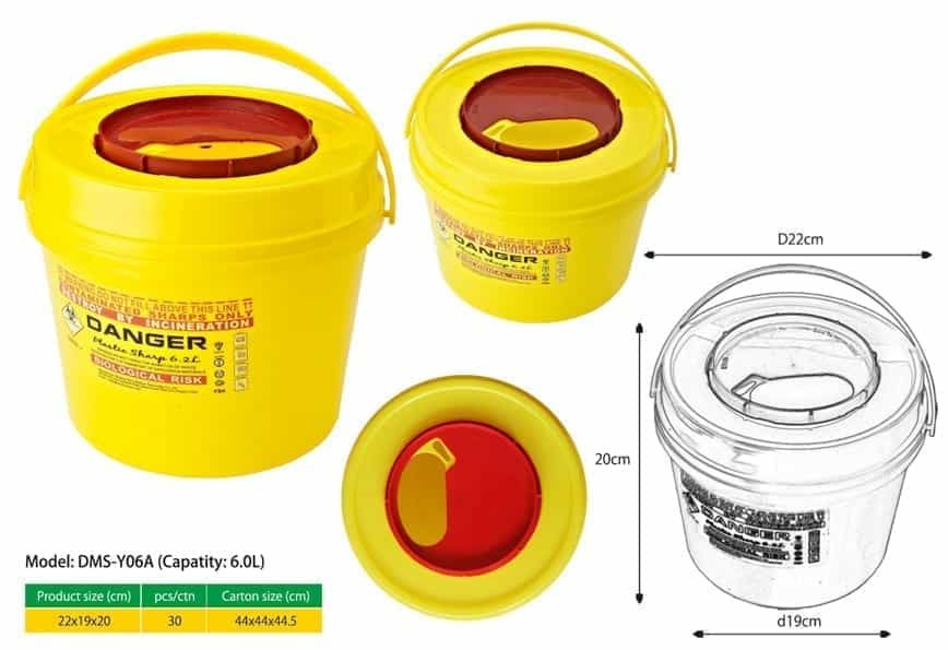 This sharps container is designed in the traditional round shape. Its rigid polypropylene construction makes it leak proof and puncture and impact resistant. It has a counterbalanced door for hands-free disposal, an ergonomically-designed handle, and a practical rotating temporary lid. This sharps container can be temporary closed while in use, and permanently closed when full with a secure final lock that prevents reopening.