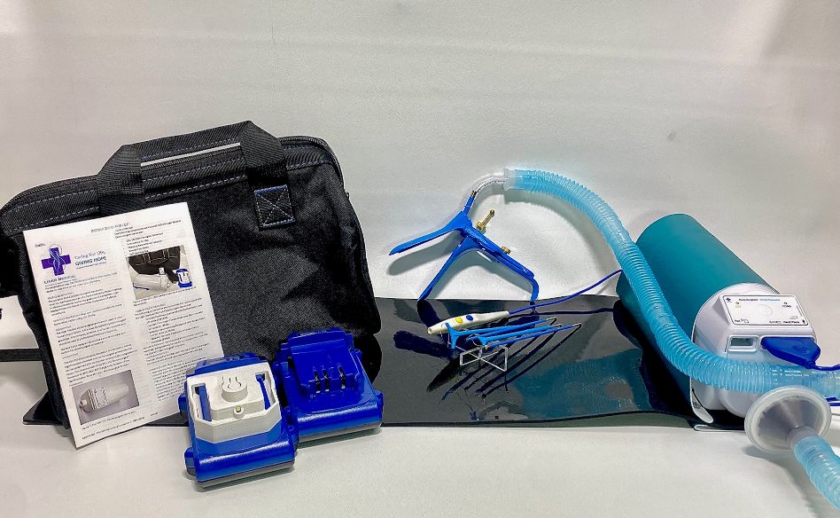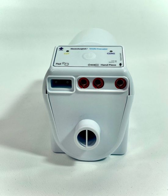 The port at the front of the devices allows for a HEPA carbon filter and smoke evacuation tubing to be connected to a Graves Speculum.